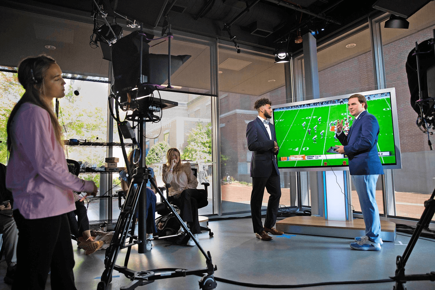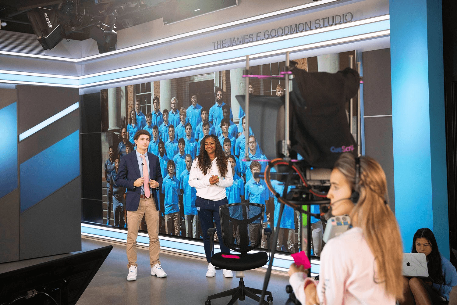 The James F. Goodmon Studio is a professional broadcast studio and control room that occupies the ground floor. Passersby can see activity in the studio through a floor-to-ceiling wall of glass. A 16x9-foot high-definition LED screen fills an entire studio wall. It is visible to all who stop to view the video content, which includes campus news, cultural event performances, and sporting events.